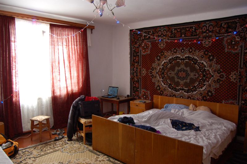 Наше обиталище расположено во втором слева овраге (номер 98, только не спрашивайте, чего именно), и представляет собой добрую, практичную, и немногословную хозяйку, вокруг которой наблюдается довольно большой двухэтажный дом -- на первом этаже кухня, туалет, где-то, говорят, есть душ, но я его пока не нашёл. Второй этаж -- коридор с комнатами, во все пока не довелось заглянуть, но наша -- большая, светлая и тёплая, наверное, как та, в которой мы на прошлый НГ на Эльбрусе вшестером жили.