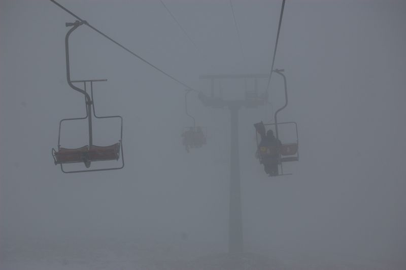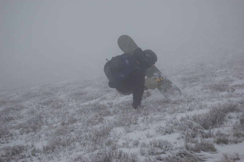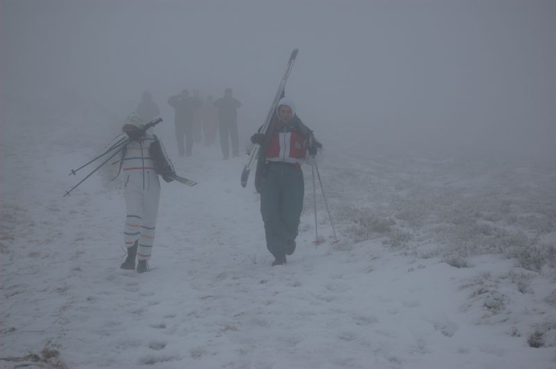 В околовершинной части горы замечен снег, вполне пригодный для катания, однако видимость в тумане -- шагов десять, и суммарная протяжённость "трассы" -- примерно как на Харьковской Швейцарии, ниже начинается ледовая зона, и поля черники. Самый уместный вид транспорта -- зорб.